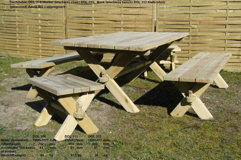 madera pino, impregnada a presion DOL 314 mesa 1,90 m x 1,03 m DOL 313 taburete 0,65 m x 0,44 m DOL 312 banco 1,80 m